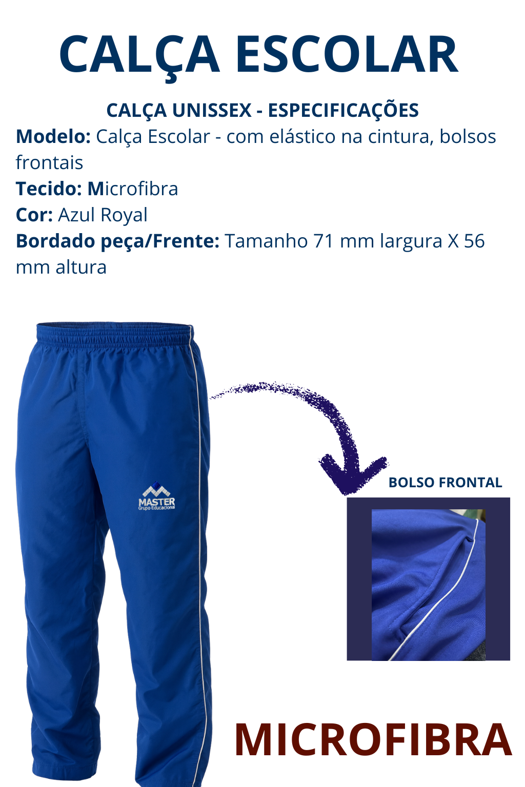 Modelo: Calça Escolar - com elástico na cintura, bolsos frontais